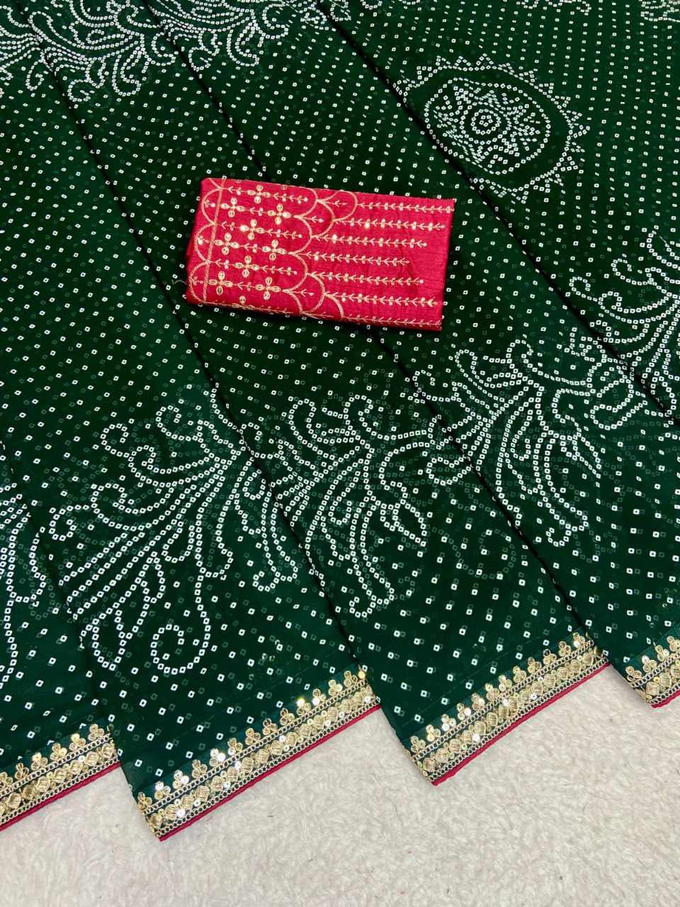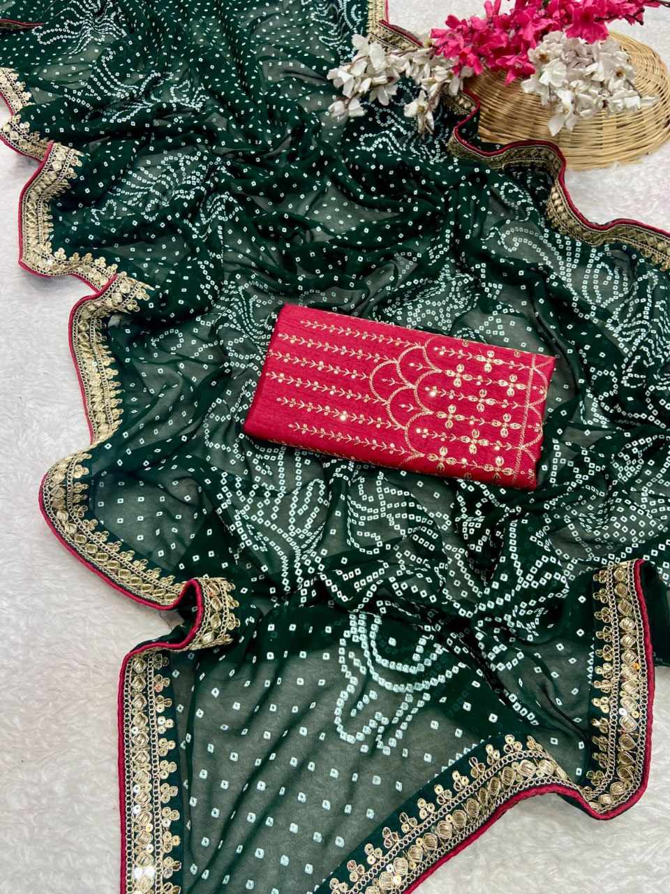 | Name : | RC Green Bandhej Georgette heavy Coding Sequence border Saree |