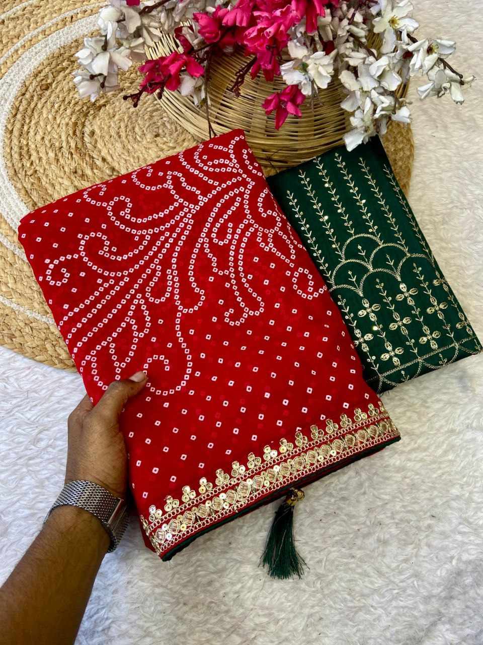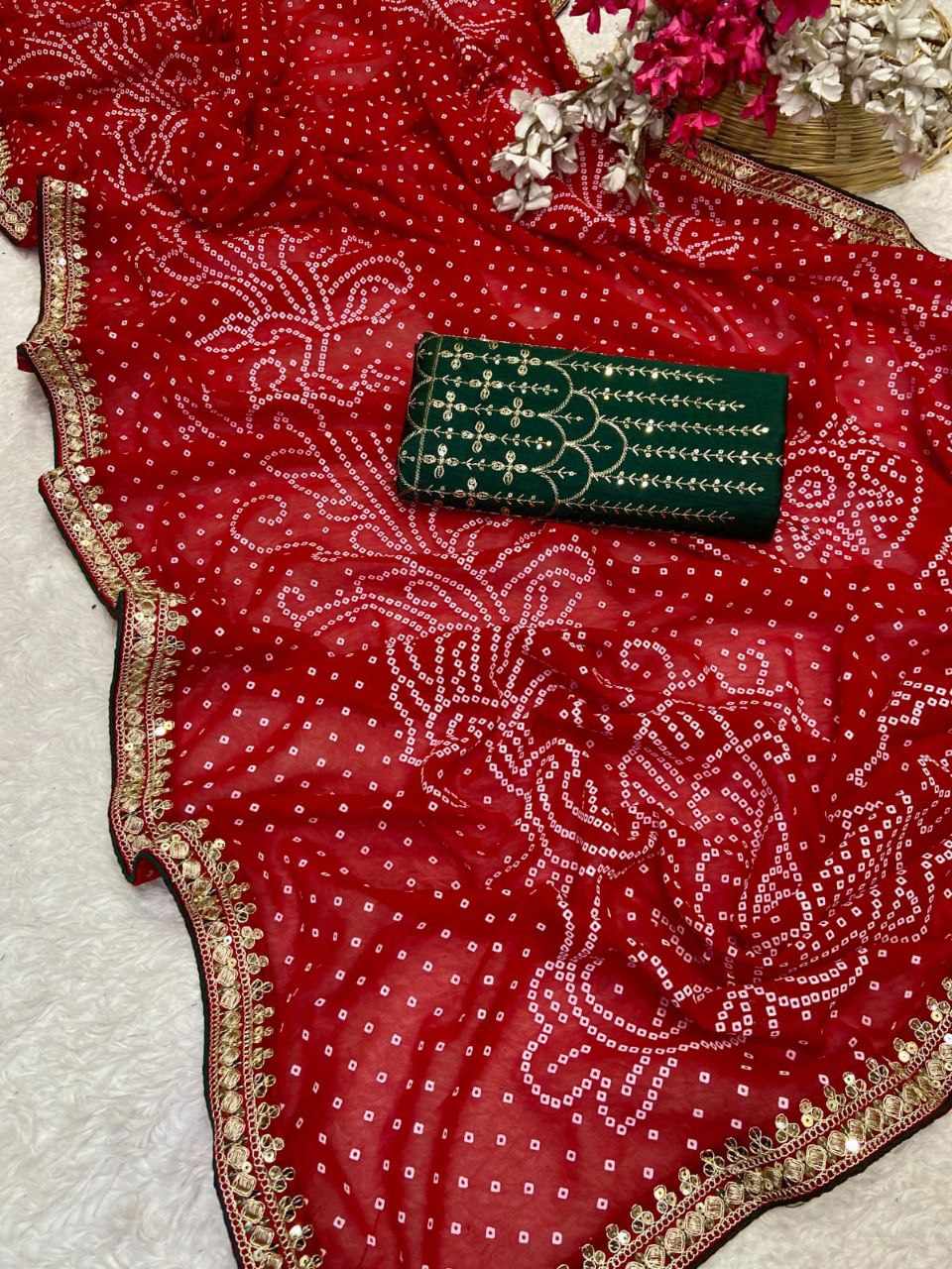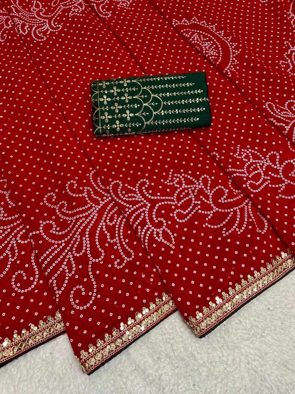 | Name : | RC Red Bandhej Georgette heavy Coding Sequence border Saree |